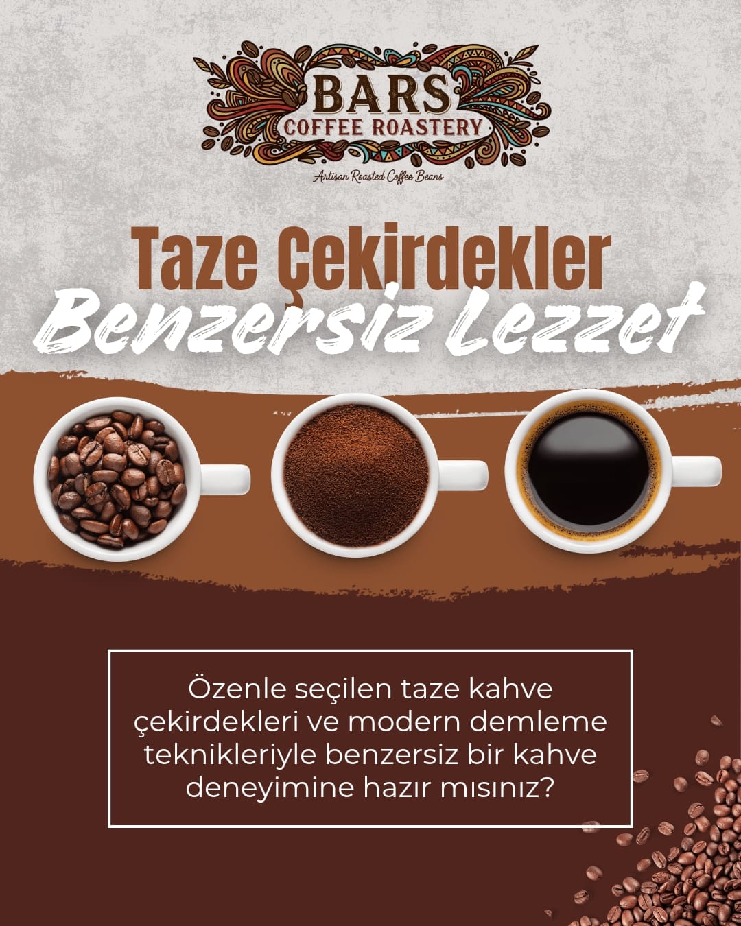 Bars Coffee Roastery olarak, yüksek kaliteli kahve çekirdeklerinin kavrulması ve satışının yanı sıra, kafe danışmanlığı ve barista eğitimi hizmetleri sunuyoruz. Kahve tutkunuzu bizimle paylaşın, işletmenizin başarısını, kahve ile aromalandırıp, bilgi ile bir üst seviyeye taşıyalım!